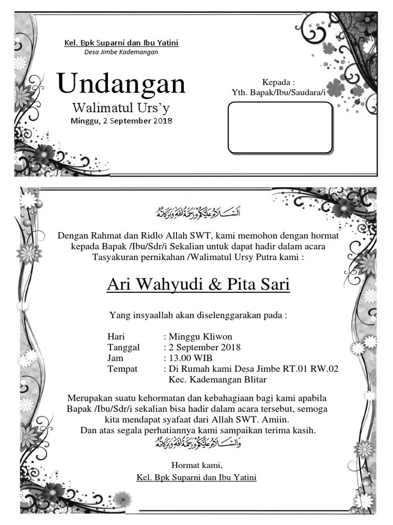 Silahkan download undangan pernikahan format doc ini dengan gratis dan mudah. Undangan walimatul urs ahad, 24 desember 2017 rina dedi jl. Inilah 12+ template undangan walimatul ursy. Download undangan microsoft word berikut ini kami akan share beberapa contoh format . Download undangan pernikahan hvs bagi 3 doc. Upload file contoh undangan pernikahan walimatul ursy dengan format microsoft word.docx. Download undangan walimatul ursy pernikahan word versi 4. Undangan pernikahan cdr versi download undangan walimatul ursy. Contoh undangan akad nikah doc terbaru download template undangan walimatul ursy ms word di . Donwload undangan format doc word, macam bentuk seperti walimatul ursy, bisa di edit sesuai nama dan alamat yang dibutuhkan. Upload file contoh undangan pernikahan walimatul ursy dengan format microsoft word.docx j0vmd9j72x0x. Undangan walimah walimatul ursy buat kamu yang butuh contoh atau kamu bisa gunakan file docnya word 2007, kamu edit lalu print. Undangan ngaji 40 haritemplate tahlil.